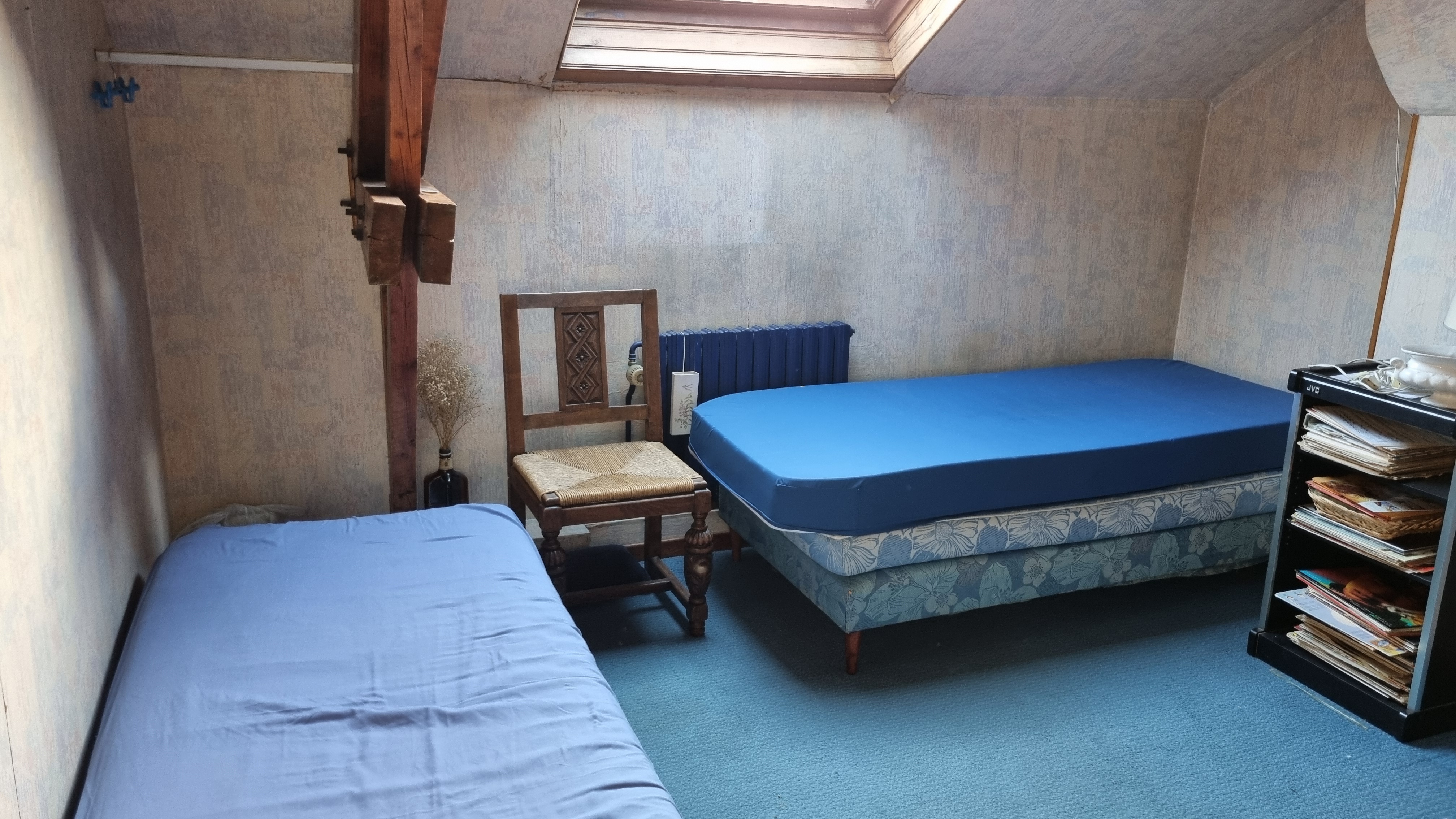 Demi étage: palier-couloir vers une salle bain avec toilettes broyeur, trois chambres de 15m² (communiquant avec la salle de bain), 9m² et 9 m²