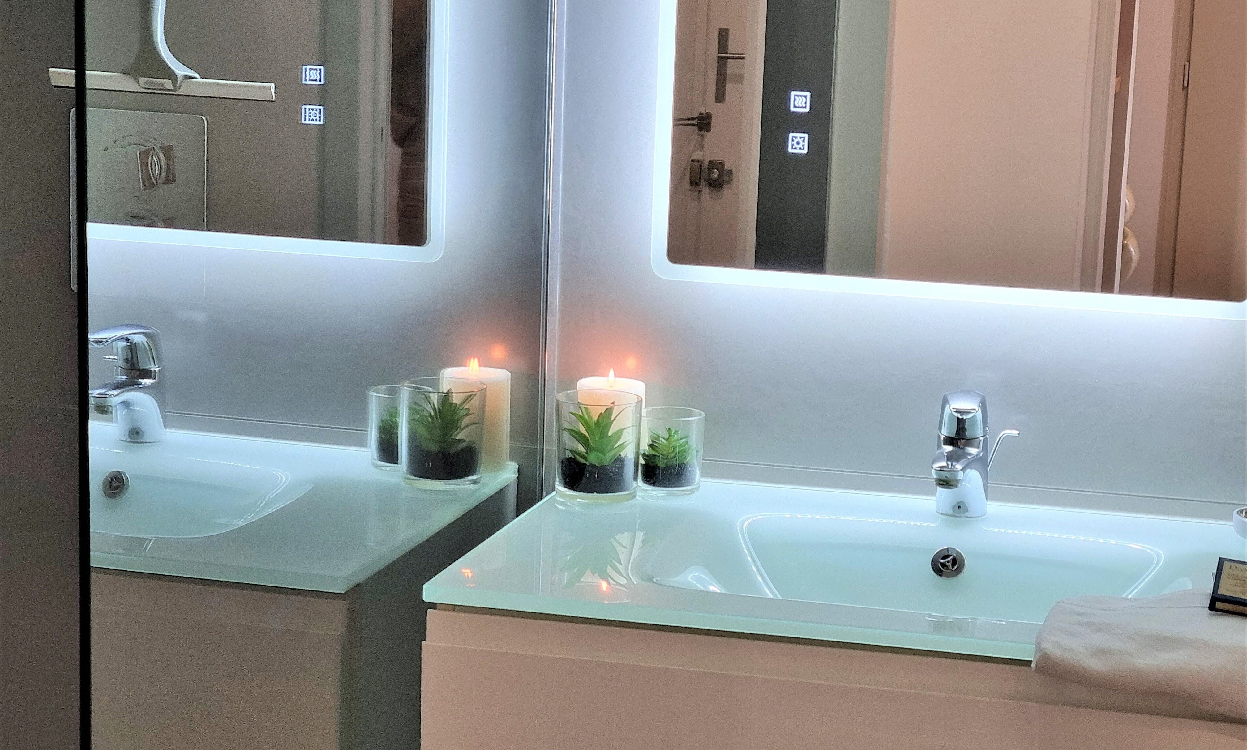 * la salle de bains, 3m², avec un meuble lavabo et une grande douche à l'italienne