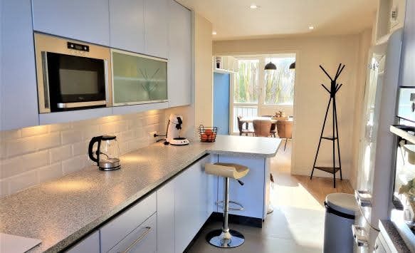 * le salon/séjour de 24 m² * la cuisine, 12m², ouverte grâce à un grand plan de travail et ses tabourets